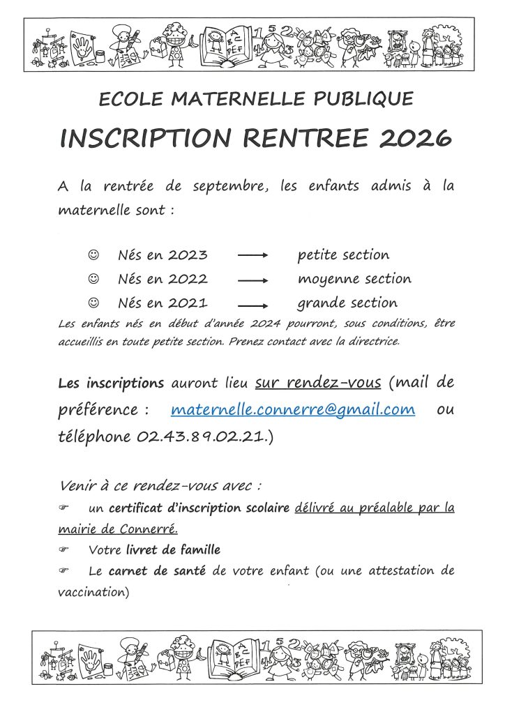 Vous pouvez dès à présent compléter le formulaire d’inscription ci-joint et nous le retourner par mail à accueil@connerre.fr accompagné d’un justificatif de domicile de moins de 3 mois et de votre livret de famille.