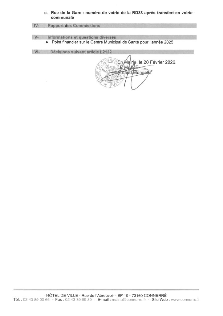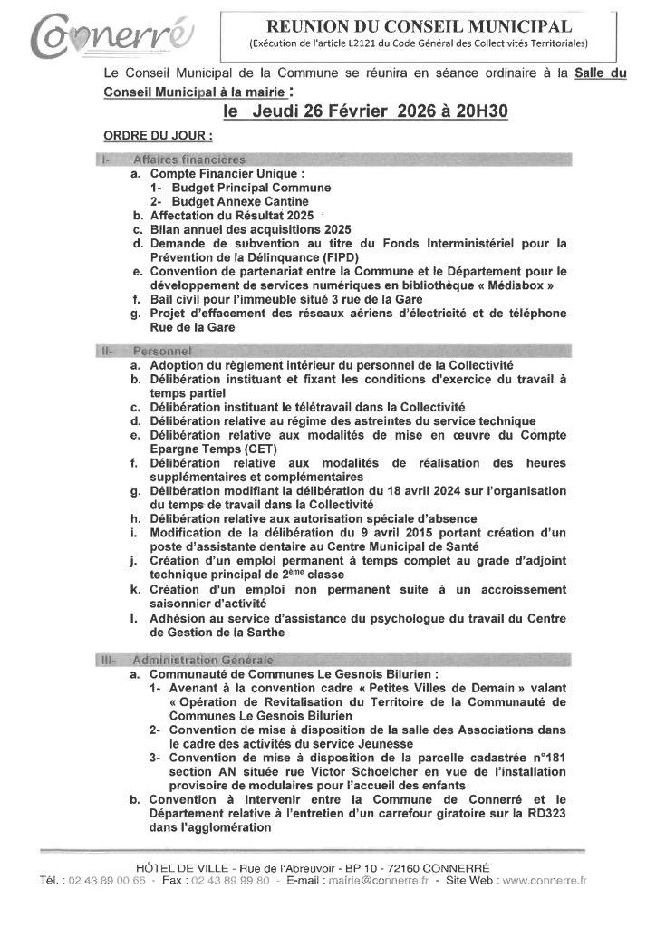 Ordre du jour du Conseil Municipal du 26.02.2026